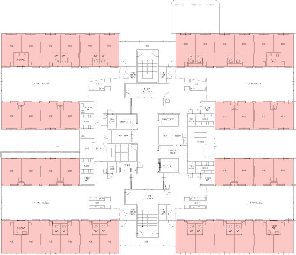 | 定員 | 80名(10名×8ユニット)全室個室、各お部屋にはトイレと洗面台を備えております。 |